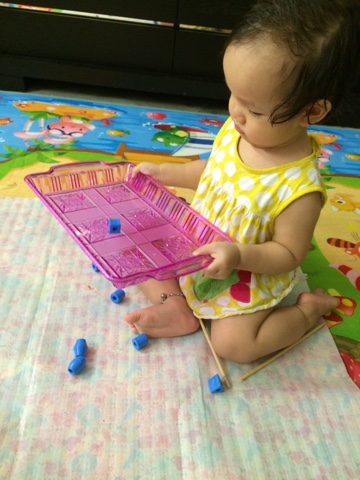 开始是自己拿着棒子的但每次串2粒以上就会掉出来,所以妈咪帮忙拿着她才可以串完全部进去。玩到最后就把珠子放上盘里摇着玩。